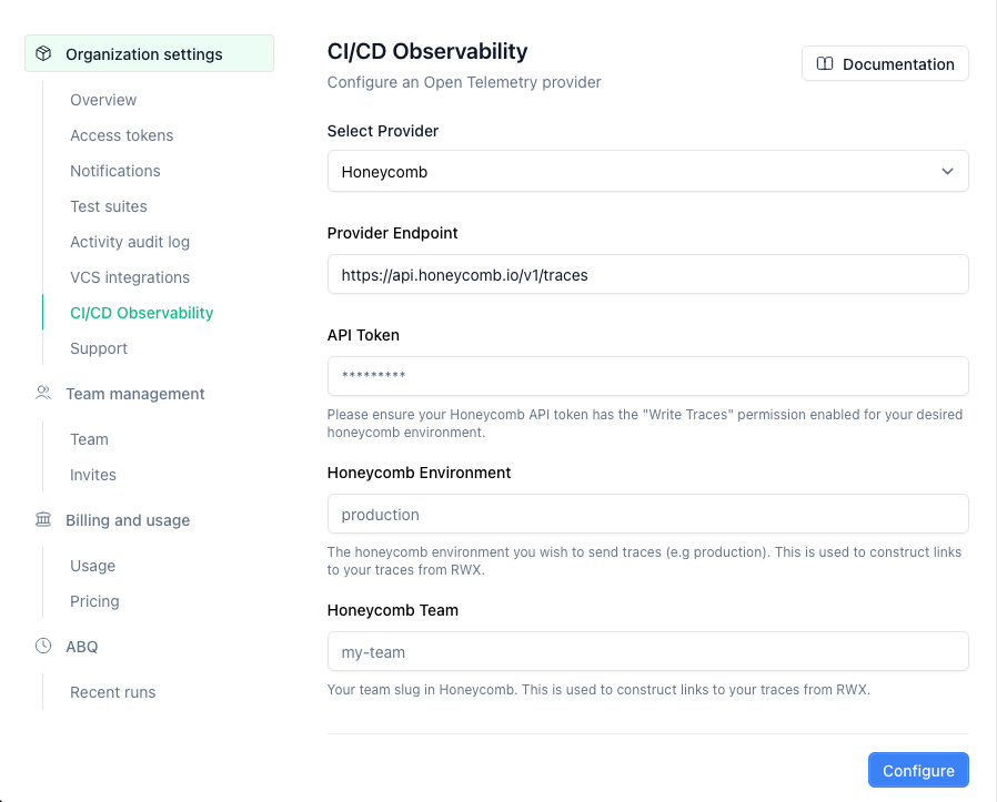 RWX can send CI/CD telemetry to Honeycomb using OpenTelemetry. This allows you to observe and analyze your RWX usage and performance in Honeycomb alongside your application observability data.