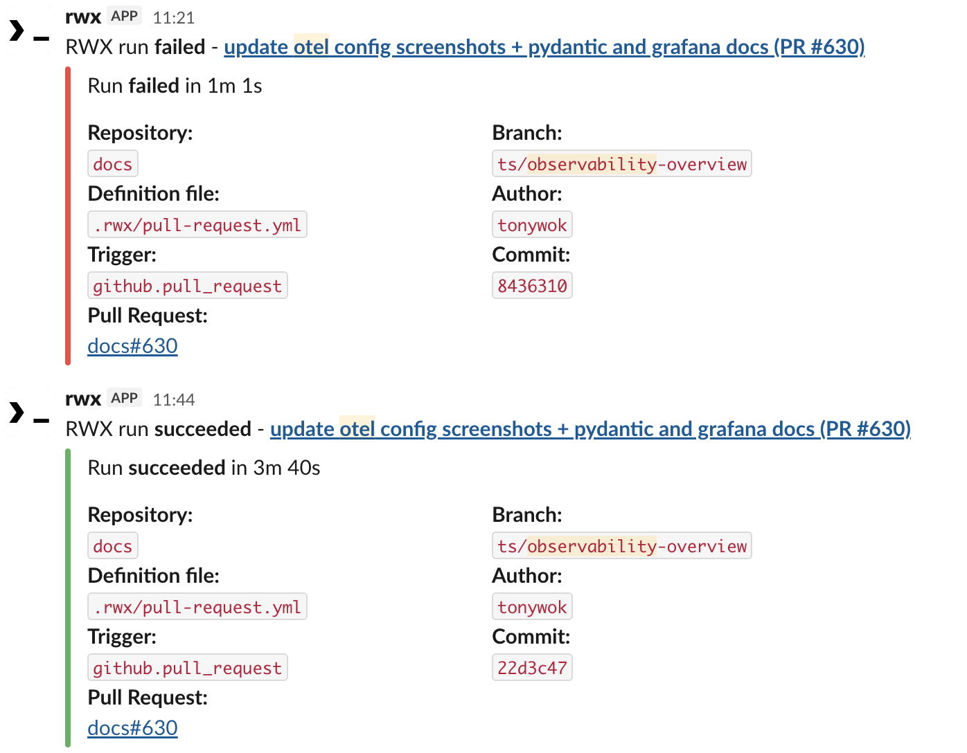 The RWX app for Slack brings your CI/CD workflow notifications directly into your Slack workspace, helping your team stay informed about build statuses, test results, and other critical events.